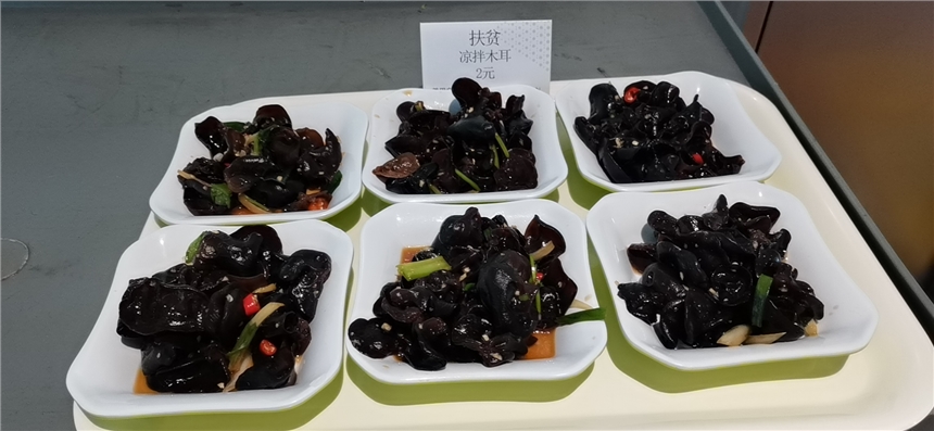 12月初,美味健康的新疆黑木耳陸續(xù)抵達(dá),餐飲公司深圳市區(qū)及大亞灣核電基地各餐廳廚師們紛紛掏出“美味秘訣菜譜”,爽口拌木耳、木耳炒雞蛋、木耳炒肉…一道道色香味俱全的“扶貧愛心菜”登上日常售飯線,一朵朵“愛心美味花兒”綻放在核電員工的餐桌上。同時,各餐廳設(shè)置特色展銷臺,通過“以購代捐”的方式向員工銷售河崖村健康無公害黑木耳。微薄之力,可聚星辰;奉獻(xiàn)愛心,收獲希望?!澳径兜篮?/span>,爽口清香又有愛,也買點(diǎn)回家給爸媽嘗嘗!”不少員工嘗過扶貧愛心菜后還紛紛加入到愛心購買的隊伍中去,把這份美味的愛心帶回家。